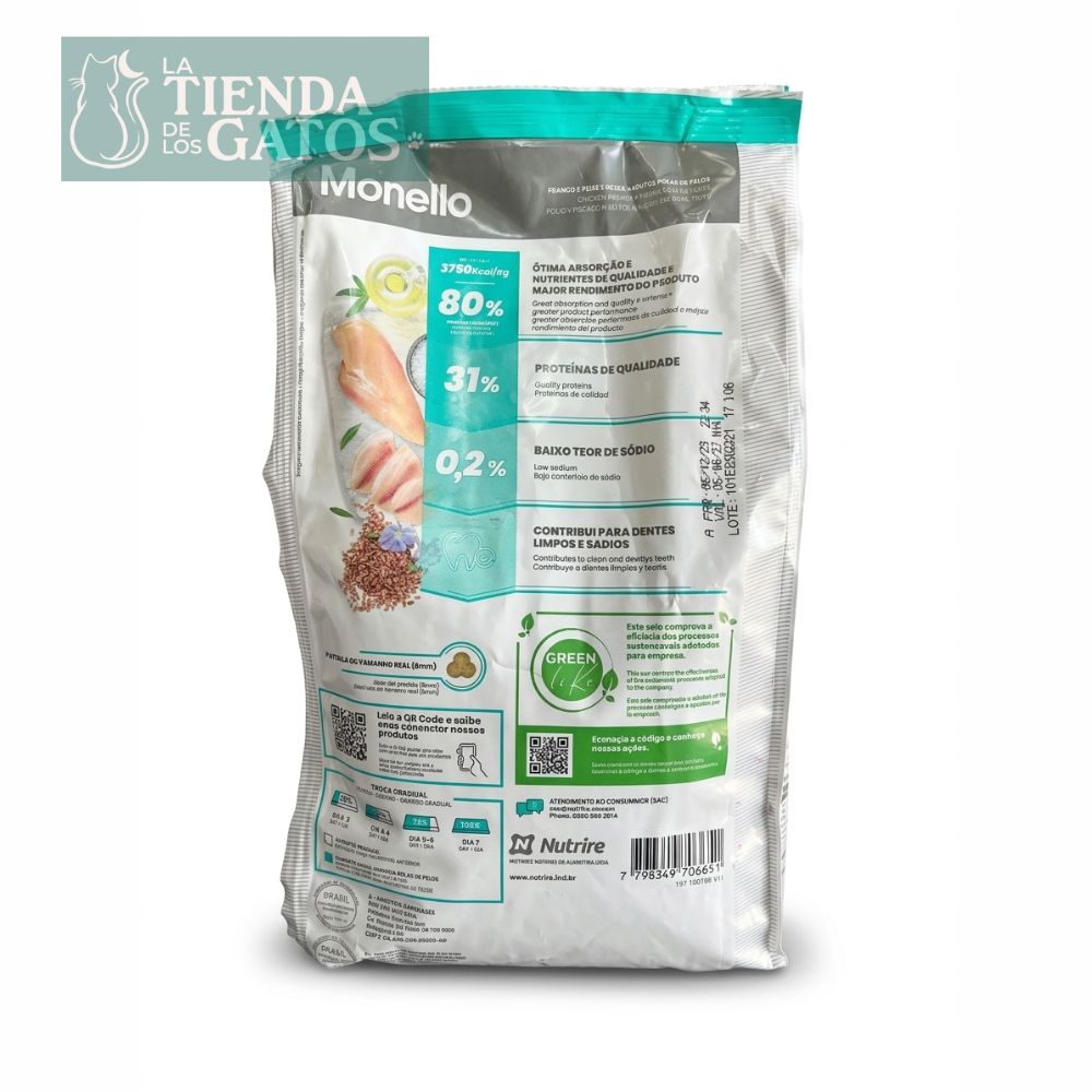 Brinde a su felino una nutrición instintiva y superior con el Alimento para gatos adultos control Bolas de Pelo Monello por 1 kg. Esta receta de alta calidad destaca por su gran aporte de proteína animal, ofreciendo una textura excepcional y un sabor natural que satisface las necesidades biológicas de los gatos más exigentes, emulando su dieta en estado salvaje.