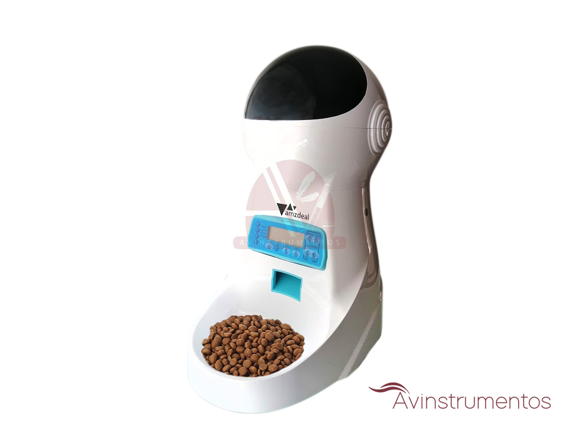 Comedero automatico para gatos programable en horario para 4 descargas de alimento diarias: Desayuno – Almuerzo – Cena y Merienda. Raciona el alimento en porciones de 5 gramos. Cada descarga de alimento se puede porgramar de 1 a 39 raciones. Permite grabar y reproducir un mensaje de voz de 12 segundos que se reproduce cada vez que se va a descargar el alimento. Tiene pantalla LCD y botones individuales que permiten la configuración total. Tiene un boton de descarga manual de alimento en raciones individuales de 5 gramos. Usa un cargador de pared de 5 voltios con cable USB de 3 metros y tiene posibilidad de respaldo de energía con 3 baterias tipo D (no inluidas). Trabaja a 110 Voltios – 50/60 Hz.
