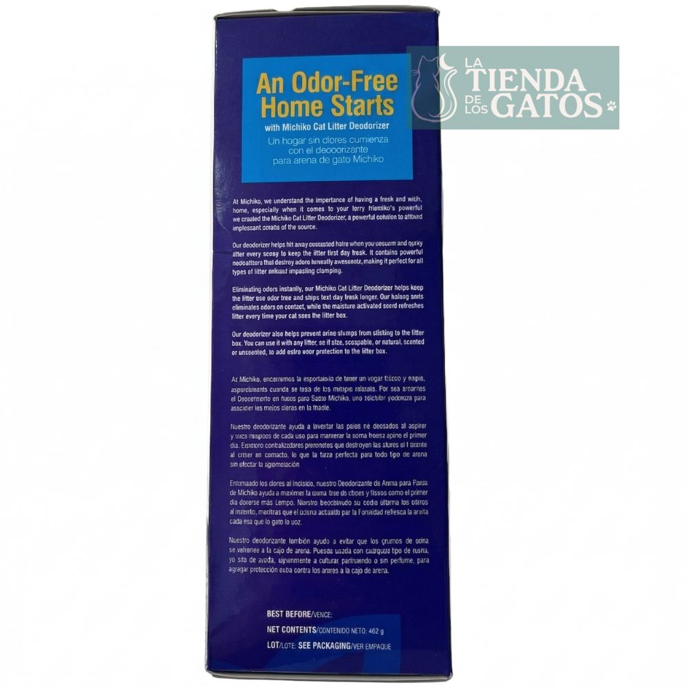 Fragancia Agradable: El Deodorizante Michiko para arenero – Caja por 462 g libera un aroma fresco que transforma el ambiente alrededor del arenero.