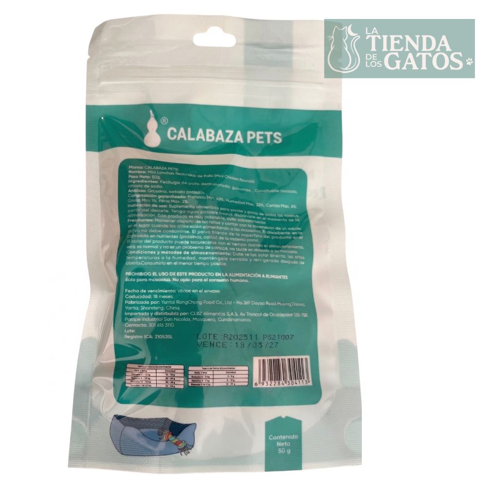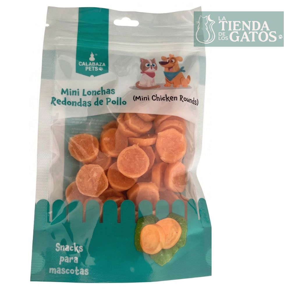Formato Mini Redondo: Las piezas del Snack gatos Mini Lonchas de Pollo Calabaza – Bolsa por 50 gramos tienen el tamaño y grosor perfectos para la mandíbula de los gatos, facilitando su consumo.